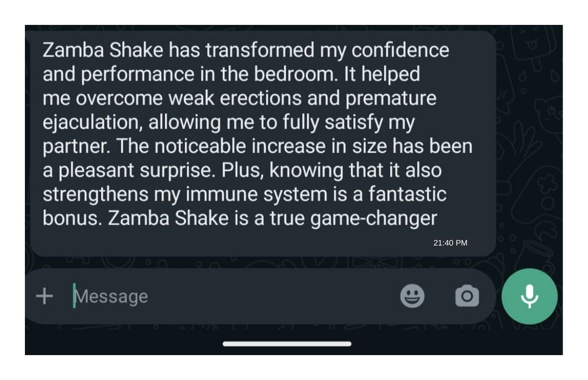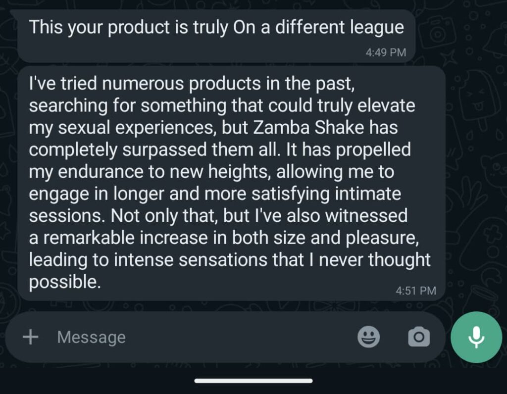 The Zamba Shake Enlarges the Penis and also Helps you Last Longer in Bed, Boosts Libido and also Gives you Harder Erection.